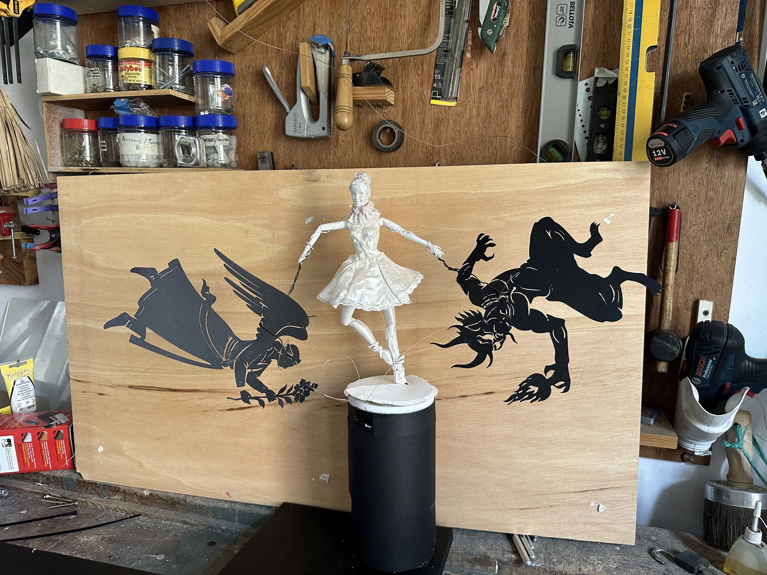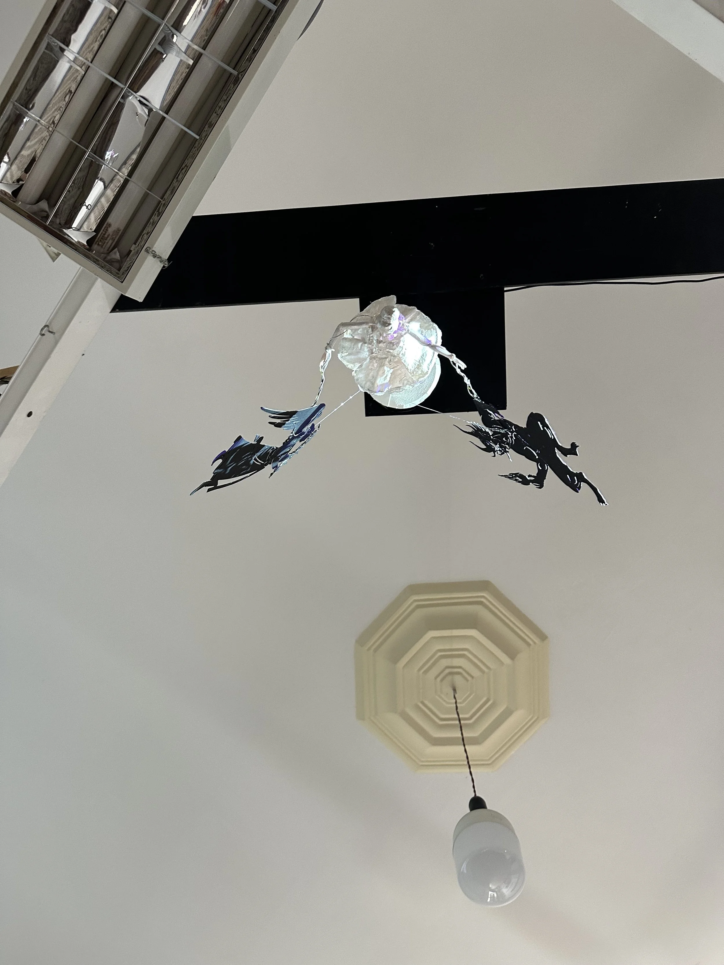 Visually, the recurring figure of a ballerina, drawn from Western classical tradition, holds and interacts with Iranian motifs of war and peace. These motifs are inspired by the drawings of Muhammad Siyah Qalam, whose works often depict hybrid figures, conflict, and cultural entanglement. The ballerina becomes a symbolic carrier of influence, suggesting how global power structures shape, interrupt, and sometimes choreograph the conditions of conflict and calm.